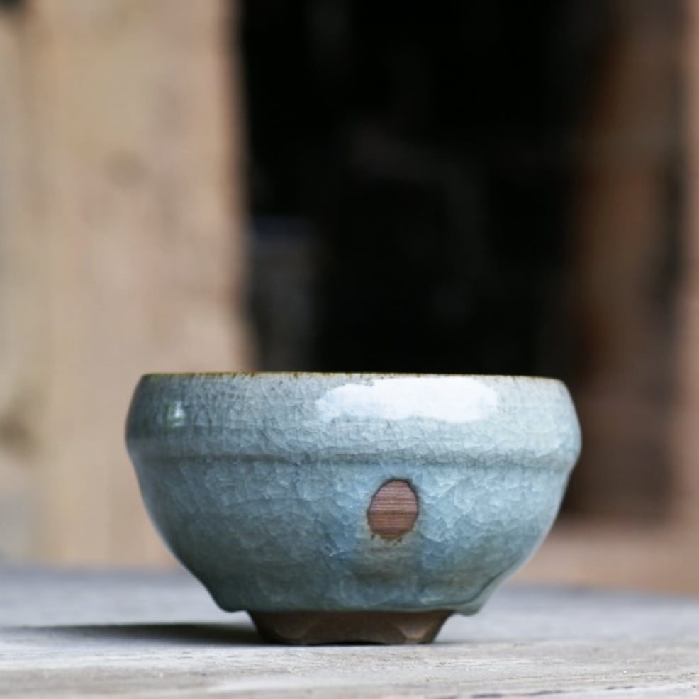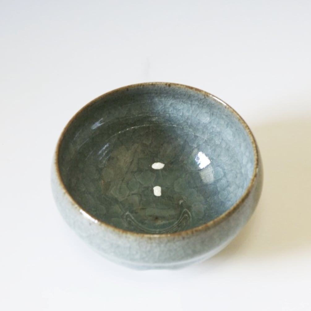 12世紀頃の中国宋時代の浙江省にある郊壇官窯で焼かれた青磁をモチーフに現代的に再現し複雑な多重貫入と薪窯による窯変効果が柔らかい色合いと、まったりした感じを醸し出している